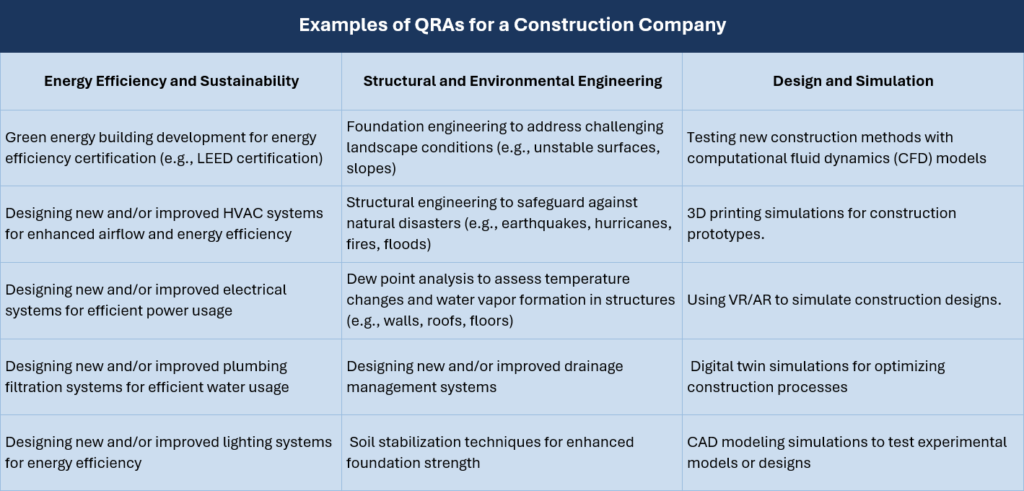 Qualified Research Activities (QRAs) refer to activities that meet specific criteria outlined by the IRS. For a construction company to qualify for the R&D tax credit, activities must pass the IRS four-part test: